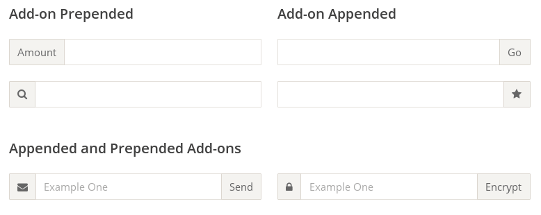 1 2 3 4 5<div class="InputAddOn"> <span class="InputAddOn-item">...</span> <input class="InputAddOn-field"> <button class="InputAddOn-item">...</button> </div>