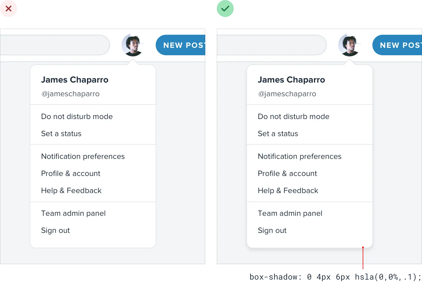 框阴影可以像边框一样很好地勾勒出元素轮廓,但可以更微妙,并且可以在不分散注意力的情况下实现相同的目标。