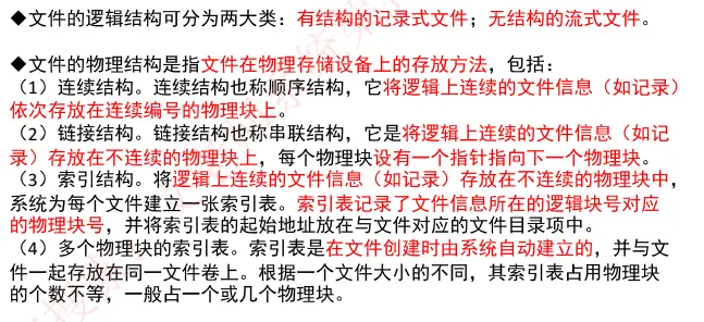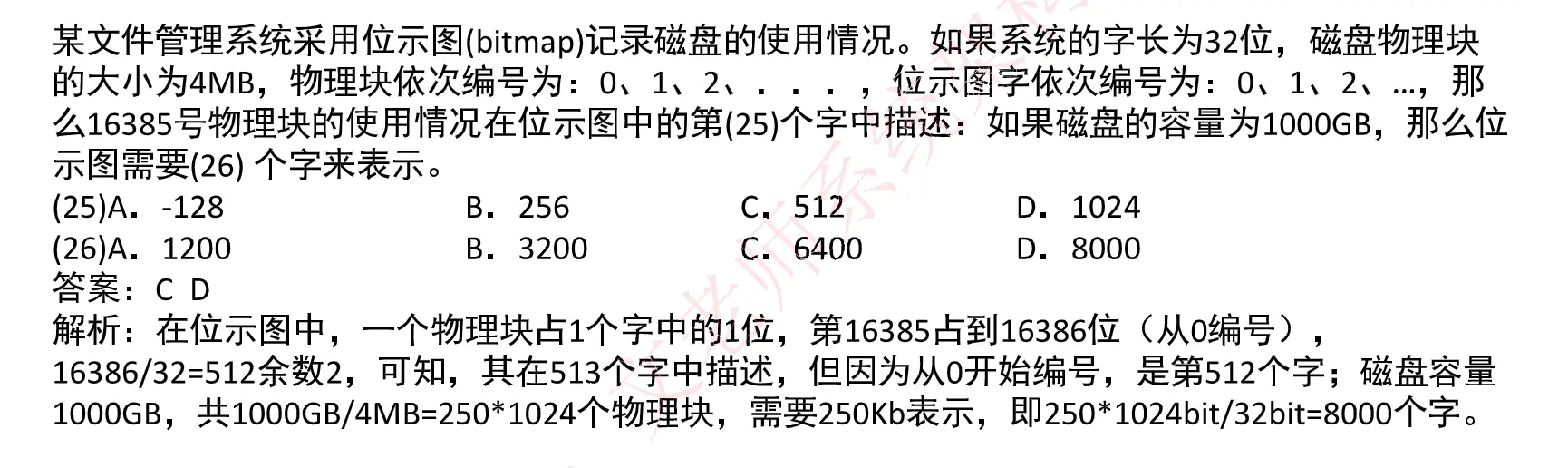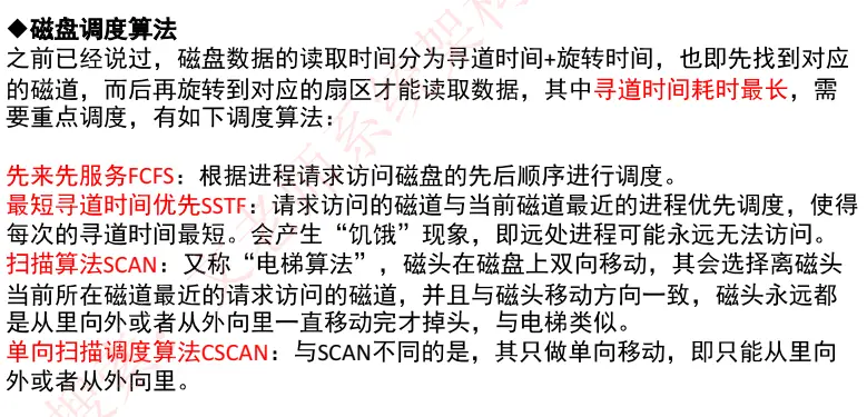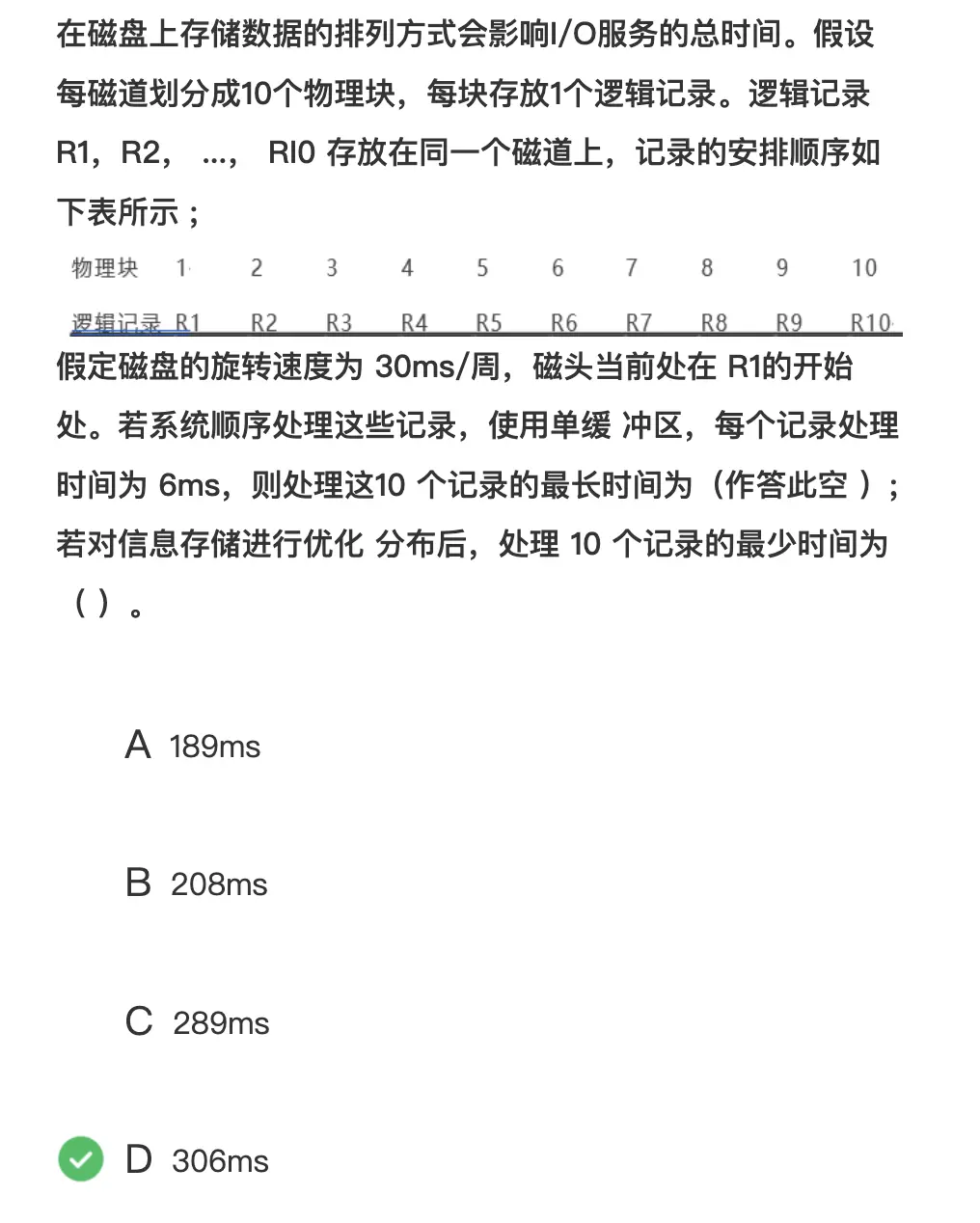 - 求磁道记录的最长处理时间和最少处理时间: 通常给出逻辑记录的安排顺序表,磁盘的每周旋转速度,每个记录的处理时间,需要注意还有个隐含的条件是磁盘的每块的旋转时间,且当前快数据旋转读取完后才能开始处理,求出隐含条件后带入公式计算。