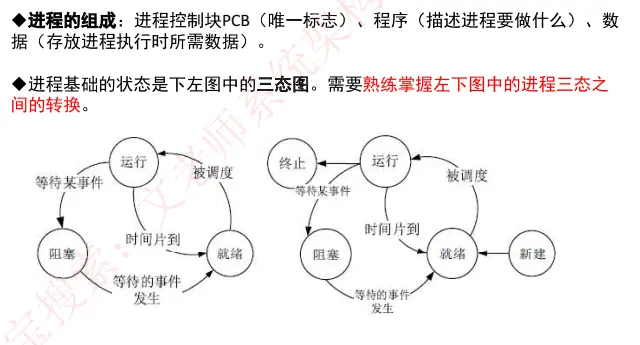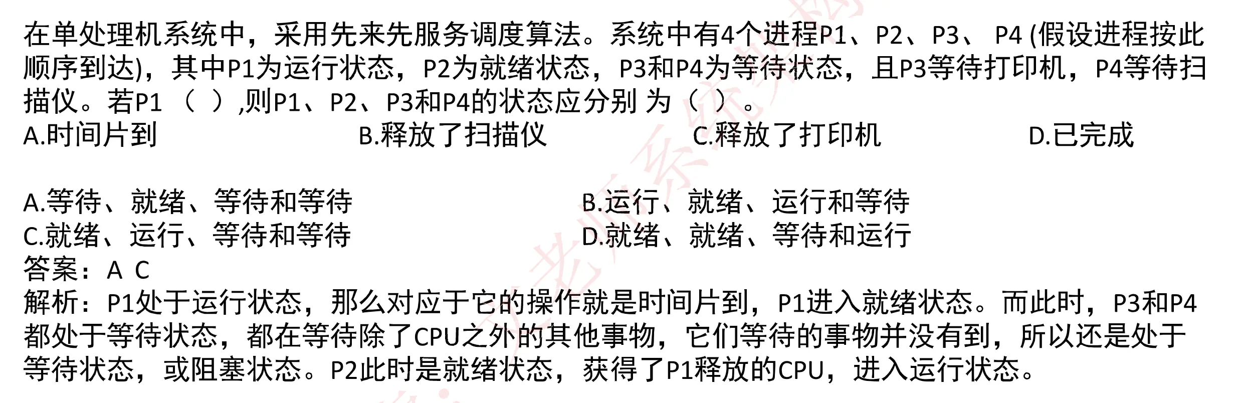 - 考察进程三态图之间的转换: 给定服务调度算法、给定几个进程的当前状态,某进程发生某事件后,求所有进程的后续状态。以三态图的转变带入后解题。