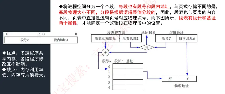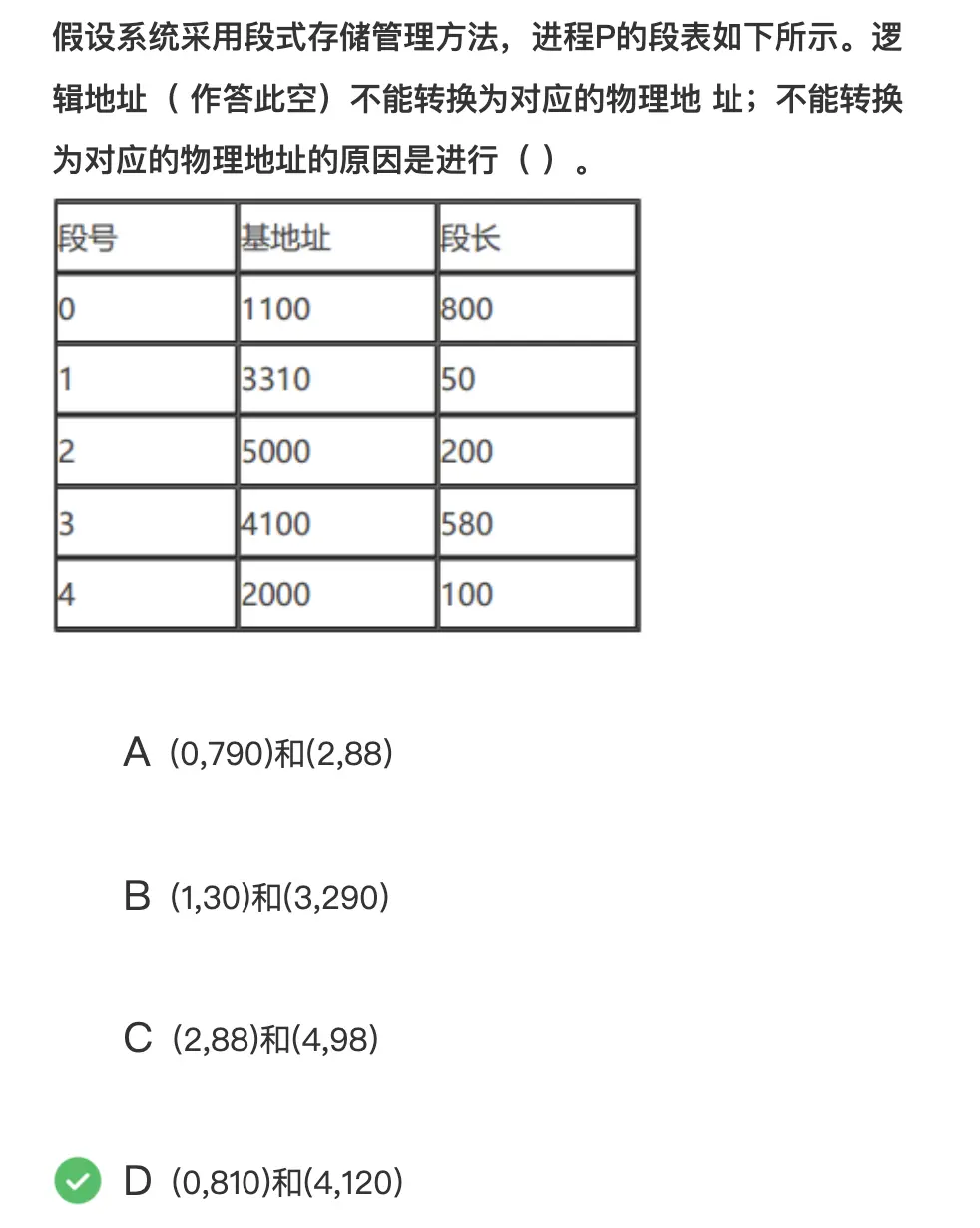 - 求段式存储中逻辑地址能否转换为物理地址(不违法),给定几个(段号,段内偏移),然后表格中给出段号和段长列,根据段号找到段长,段内偏移大于段长就违法。
