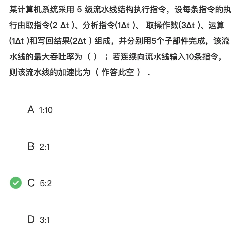 - 流水线的加速比: 不使用流水线的执行时间 / 使用流水线的执行时间