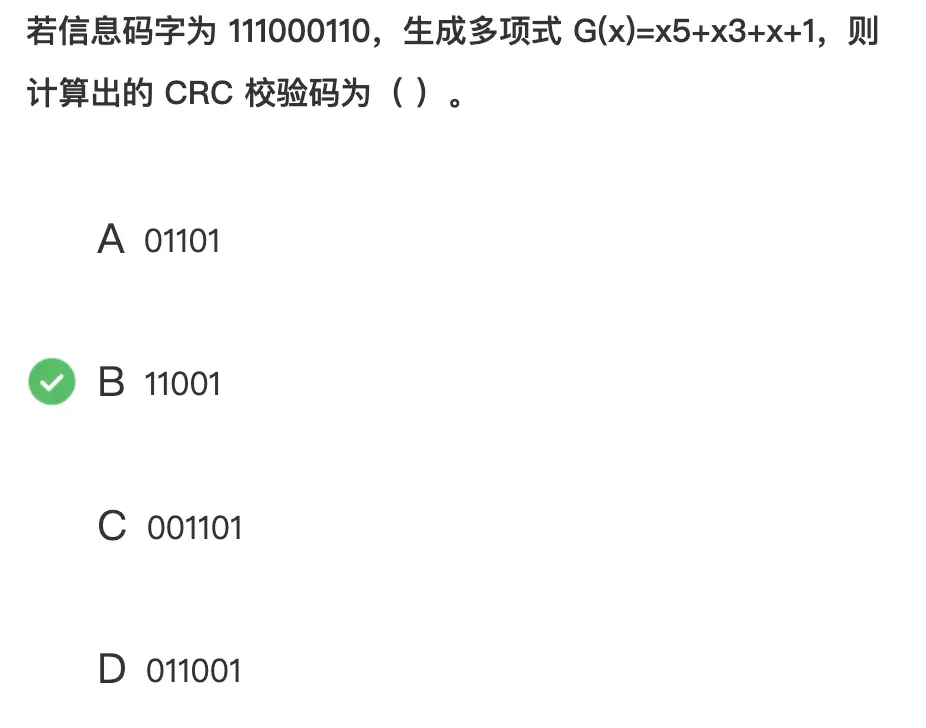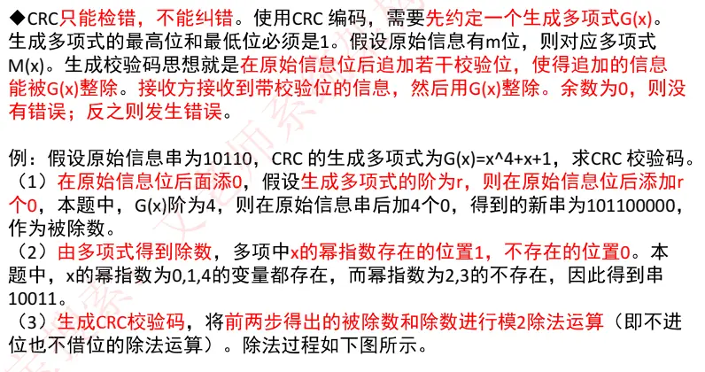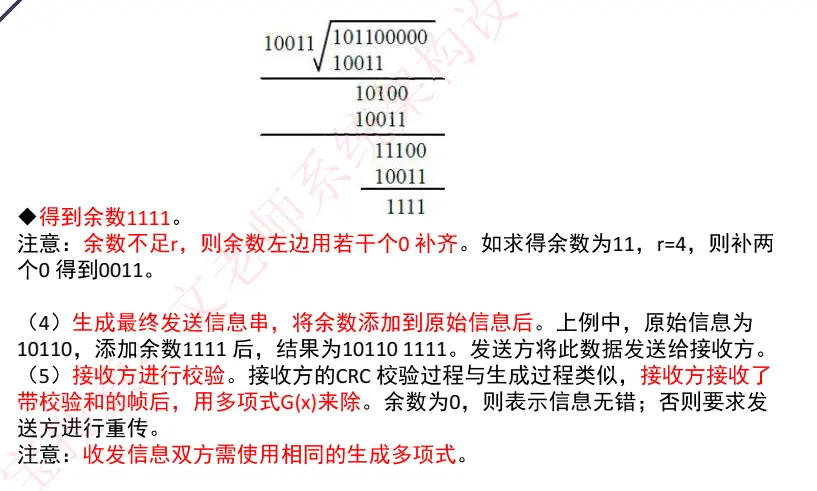 - CRC 编码: 1. 在原始信息串后面补多项式的阶个零; 2. 求除数,多项式中幂指数存在的为 1,不存在为 0; 3. 求校验码,进行模 2 除(异或运算),余数如果不足多项式的阶的位数则在左边补 0