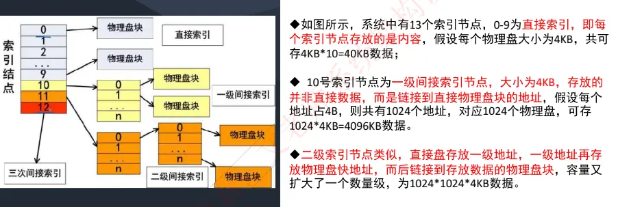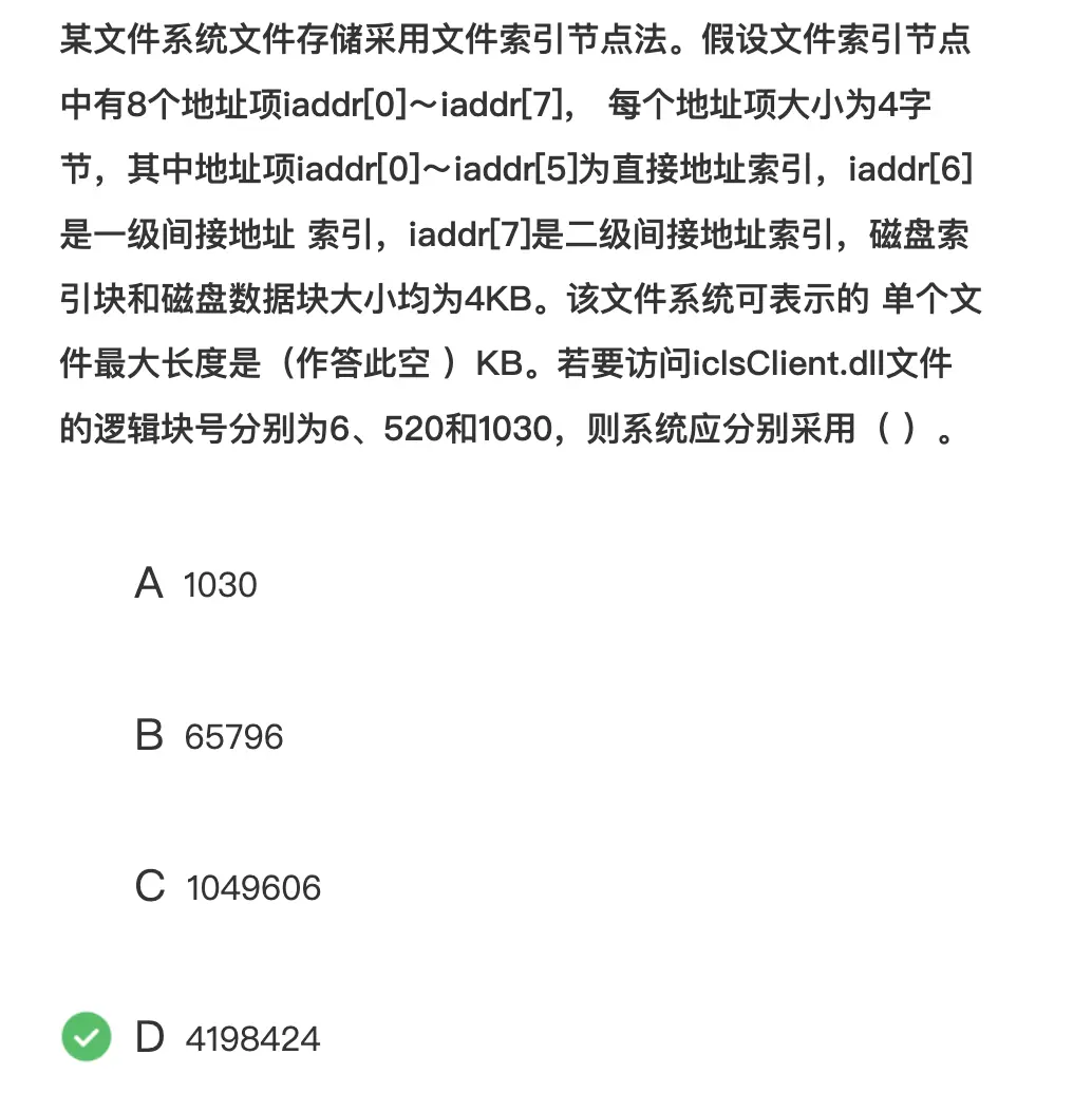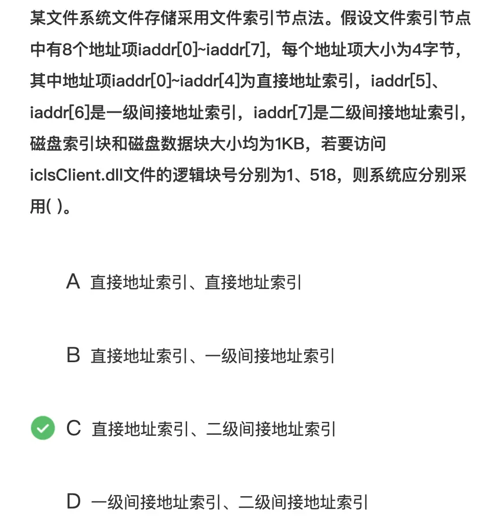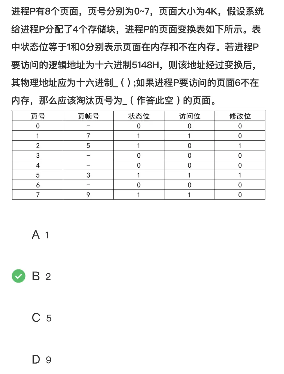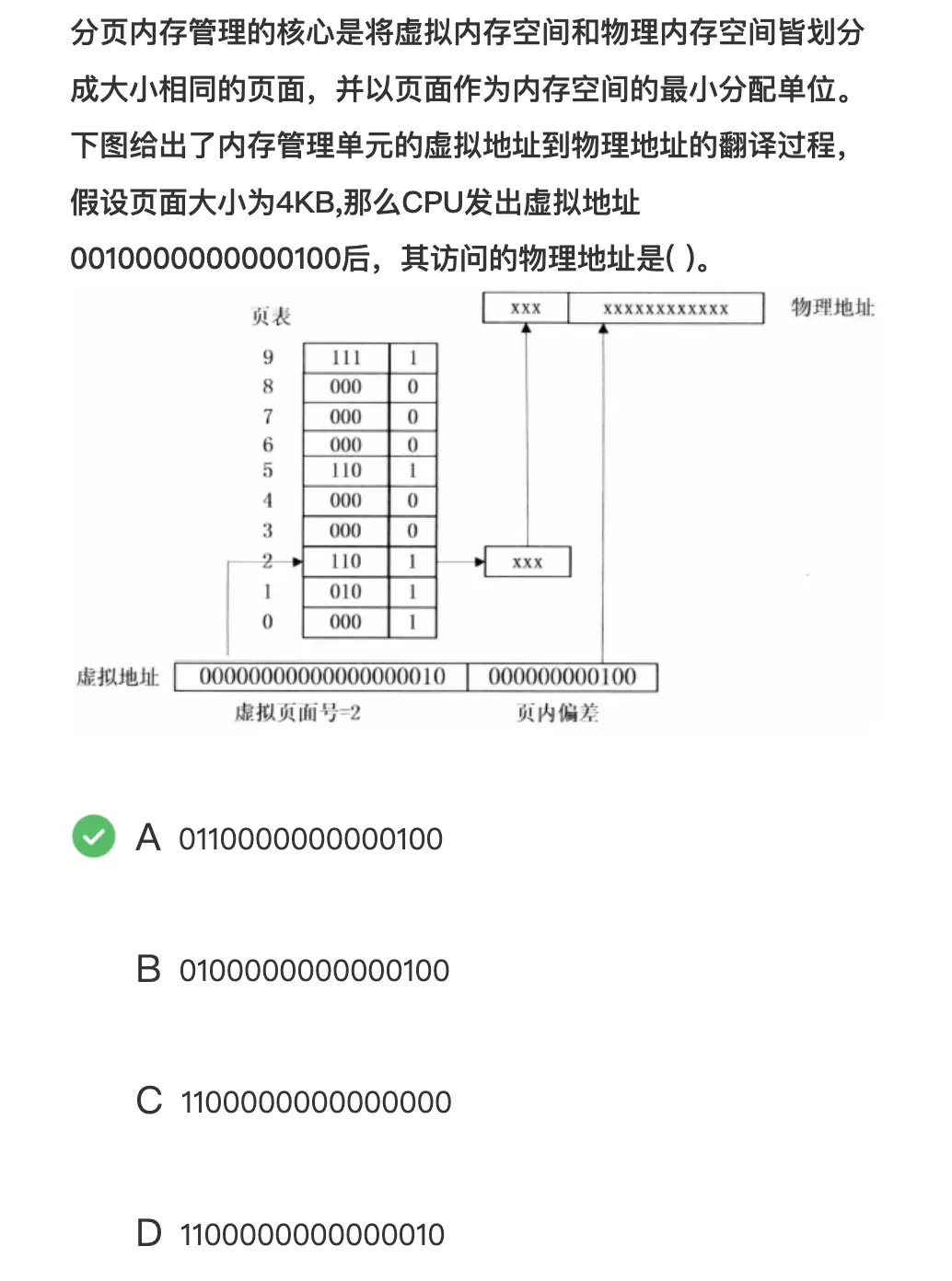 - 求分页式存储的物理地址: 通常给出页面大小和逻辑地址,以及页号和物理块号的对应表,让求物理地址。首先通过页面大小算出页内地址的位数(也可以直接看答案中,多数答案与逻辑地址后面几位重复,且前面剩余的在页表里能查到,则其为偏移地址位数,页面大小通常为 4k,则二进制表示为 4 位,16 进制表示为 1 位),剩余高位为页号,通过页号找到对应的物理块号,然后将逻辑地址高位替换为物理快号就是物理地址。