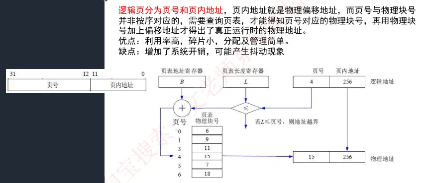 - 分页式存储物理地址: 高位通过页号在页表中查到物理块号 拼接 低位页内地址(偏移地址),逻辑地址和物理地址中低位的偏移地址不变,区别只是将高位的逻辑页号替换为了物理快号