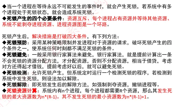 - 每个进程需要资源数不同时发生死锁的最大资源数: (进程 1 需要的资源数 - 1) + (进程 2 需要的资源数 - 1) + … + (进程 n 需要的资源数 - 1)