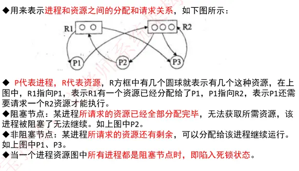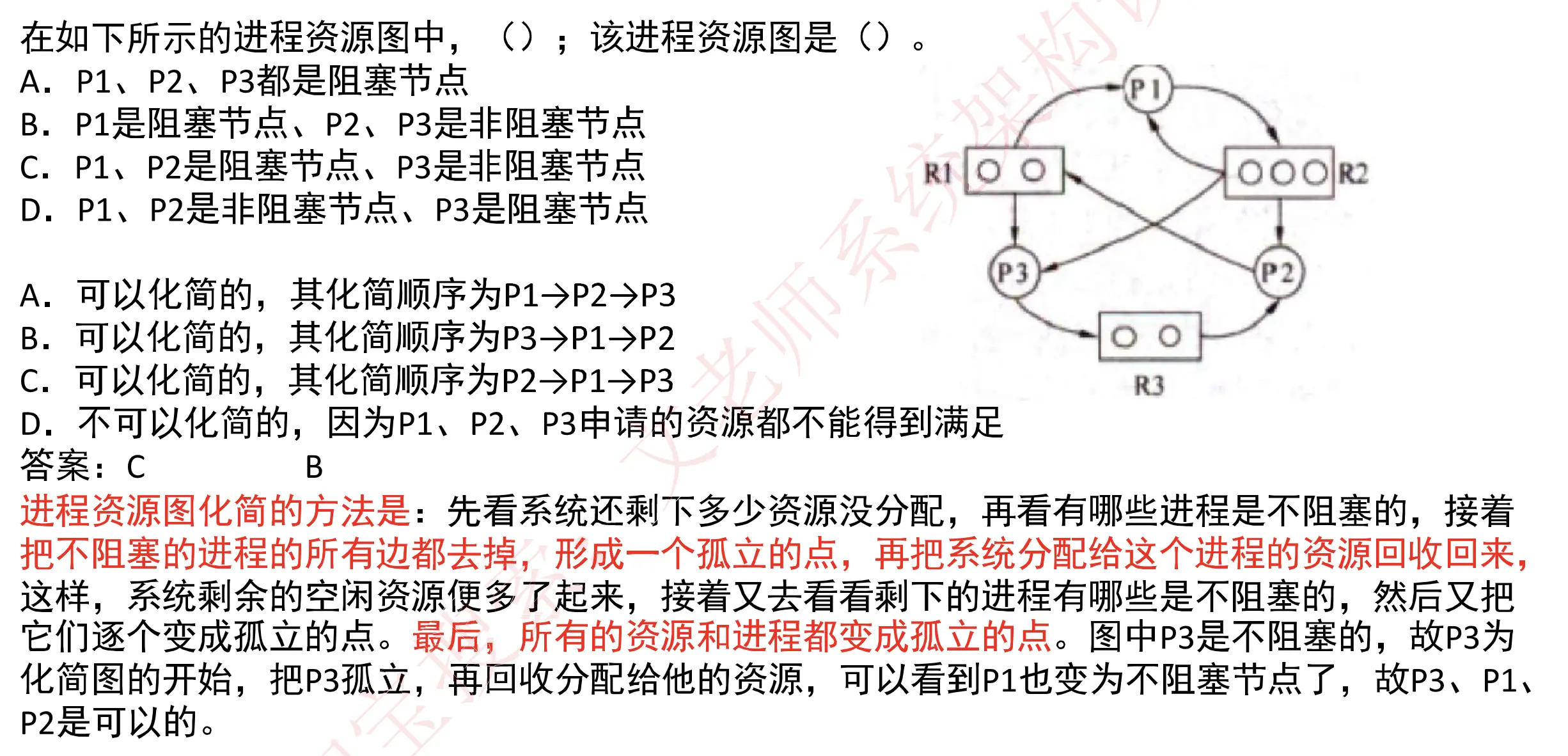 - 考察进程资源图,求阻塞节点和化简顺序:求阻塞节点,某进程所请求的资源已经全部分配完毕,该进程为阻塞节点。求化简顺序,先找非阻塞节点,然后释放其占用资源(划掉连线)后,找后续的非阻塞节点,直到所有节点都不被阻塞。