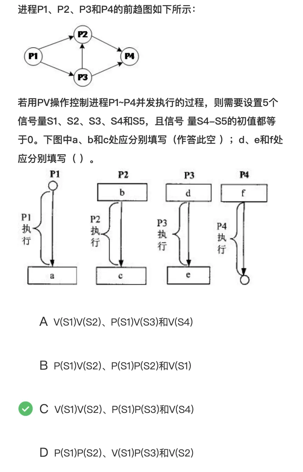 - 综合考察 PV 操作: 给定前趋图,进程,和需要设置的信号量,然后给出进程部分执行过程中的 PV 操作,求空余的部分的 PV 操作。结合前趋图来看,从最开始无依赖的进程开始填空,进程执行完进行 V 操作,有几个后继则进行几次不同信号量的 V 操作。然后后面等待执行的进行的前驱如果都执行完了,则开始执行,有几个前驱进行几次不同信号量的 P 操作。