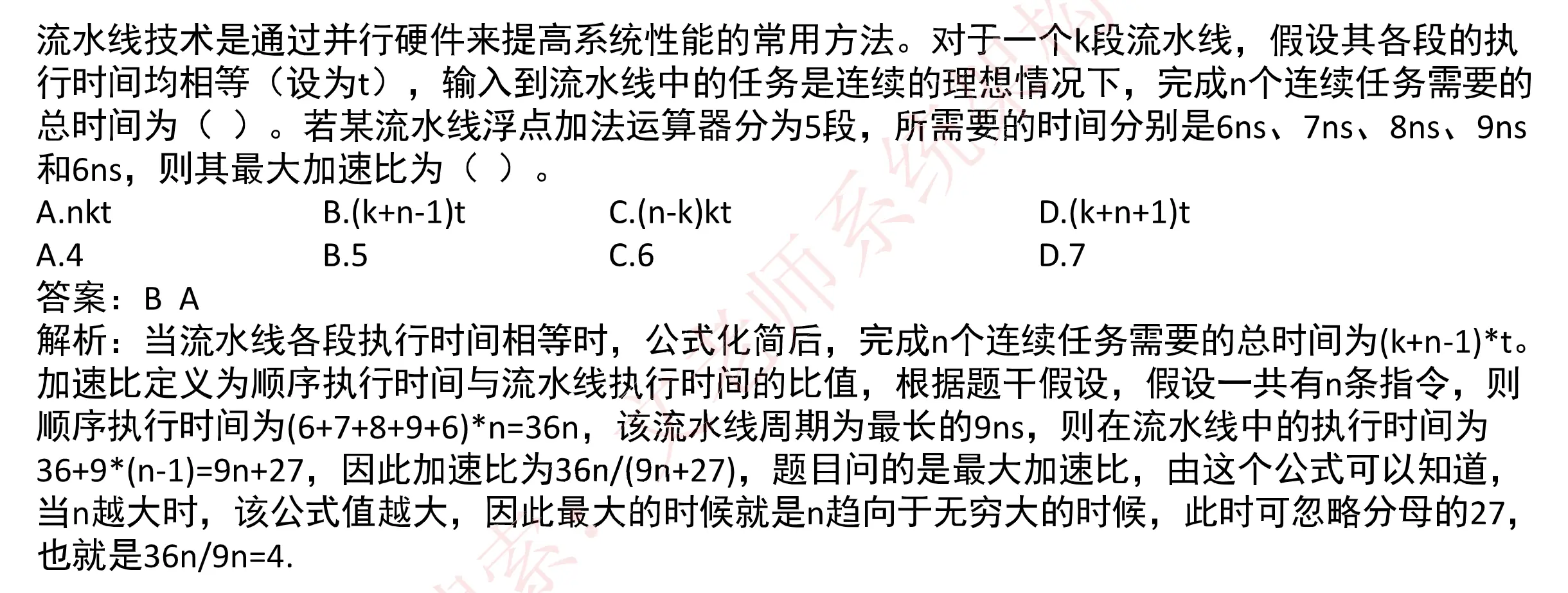 - 求流水线最大加速比: 加上最大两个字,就是求极限值了,通常不会给出总指令条数,而需要设为 n 来计算,求极限时忽略常数,带入公式即可。