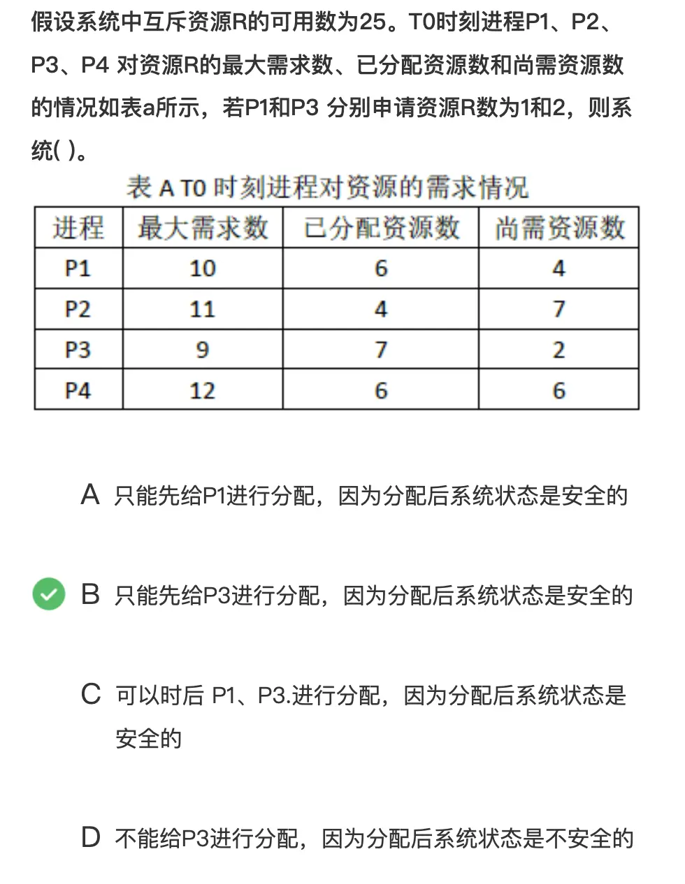 - 考察银行家算法,求当前可用的资源数和安全的执行序列: 给定资源及其可用资源总数,给定几个进程及其最大需求量和已分配资源数图示。首先用资源的最大总数-当前所有进程分配的数量求出其当前可用的资源数。然后找到所有执行序列中资源最大需求量都能满足的进程,作为可执行的进程,执行完后把这个进程上已分配的资源数加回,可用资源数,再找下一个可执行进程。