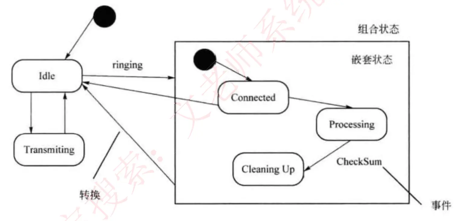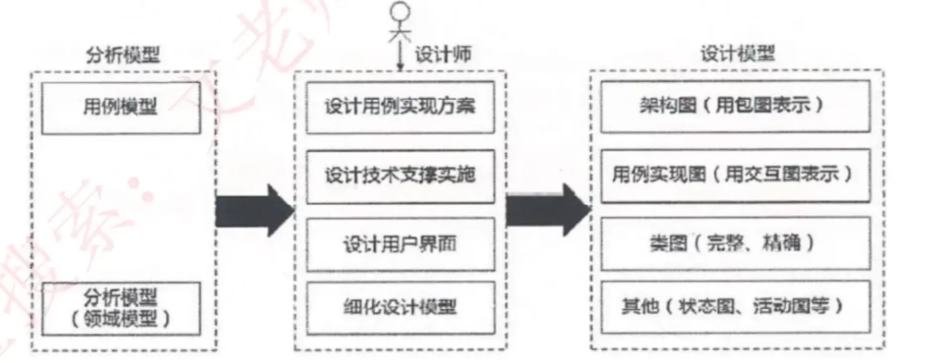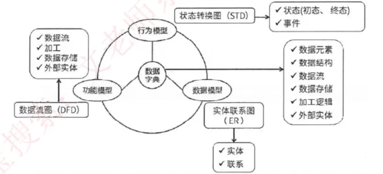 - 三大模型及数据字典:功能模型(数据流图)、行为模型(状态转换图)、数据模型(E-R 图)