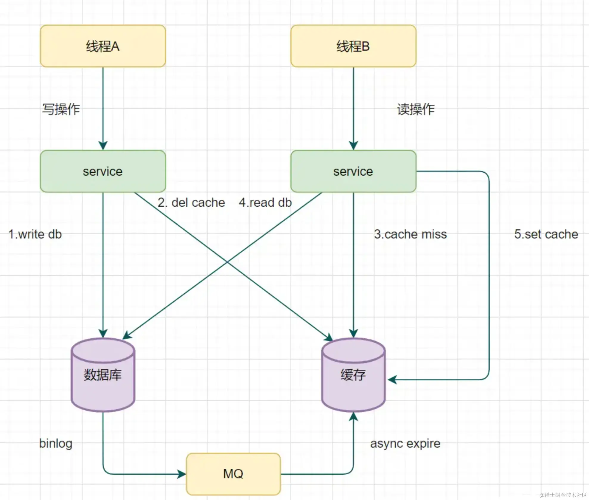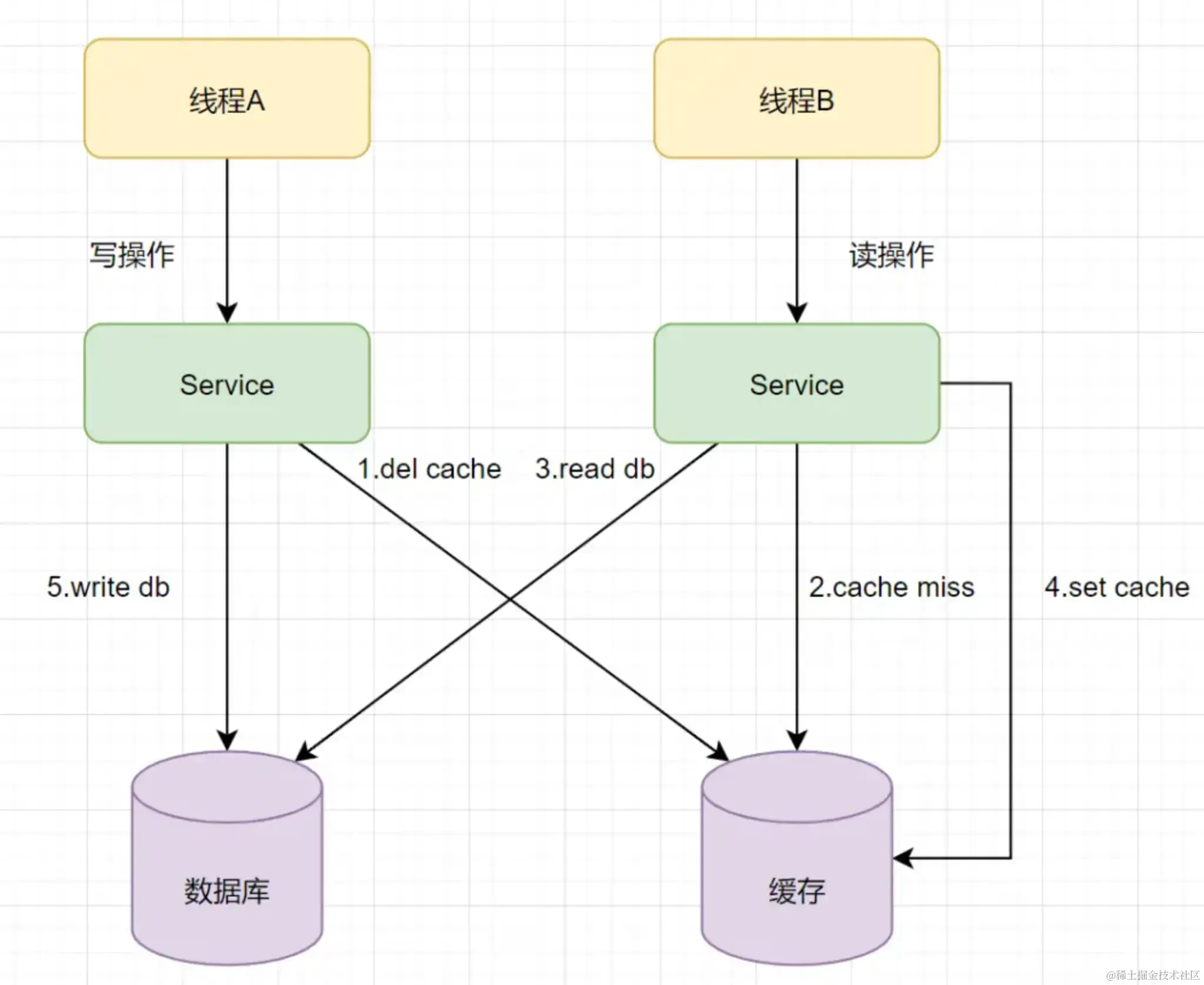 - 线程 A 发起一个写操作,第一步 del cache