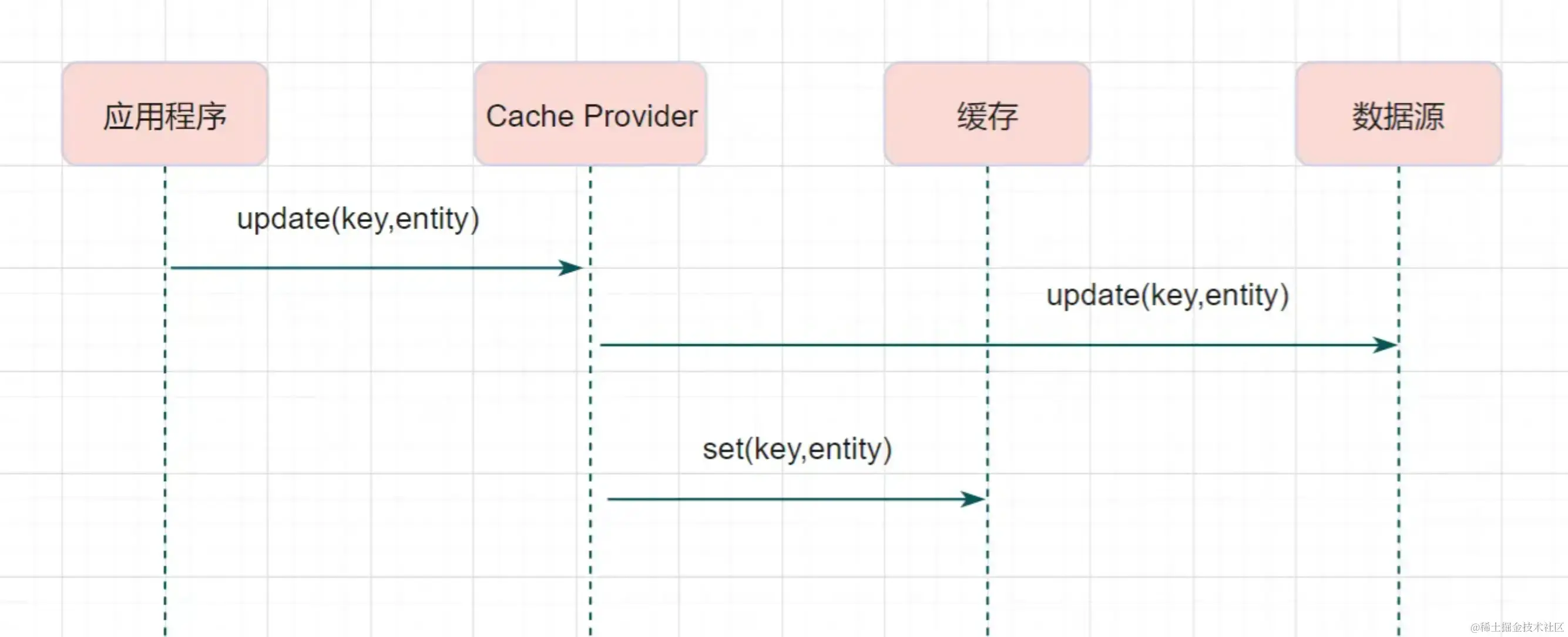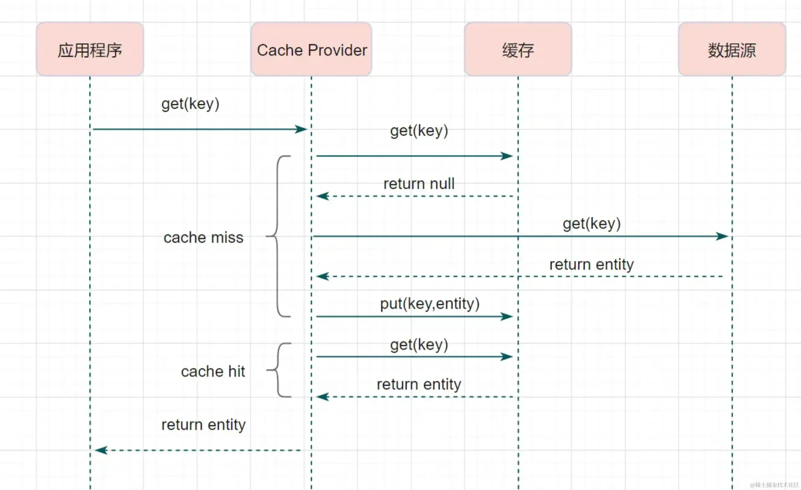 从缓存读取数据,读到直接返回,如果读取不到的话,从数据库加载,写入缓存后,再返回响应。看上去和 Cache-Aside 一样,其实 Read-Through 就是多了一层 Cache-Provider。