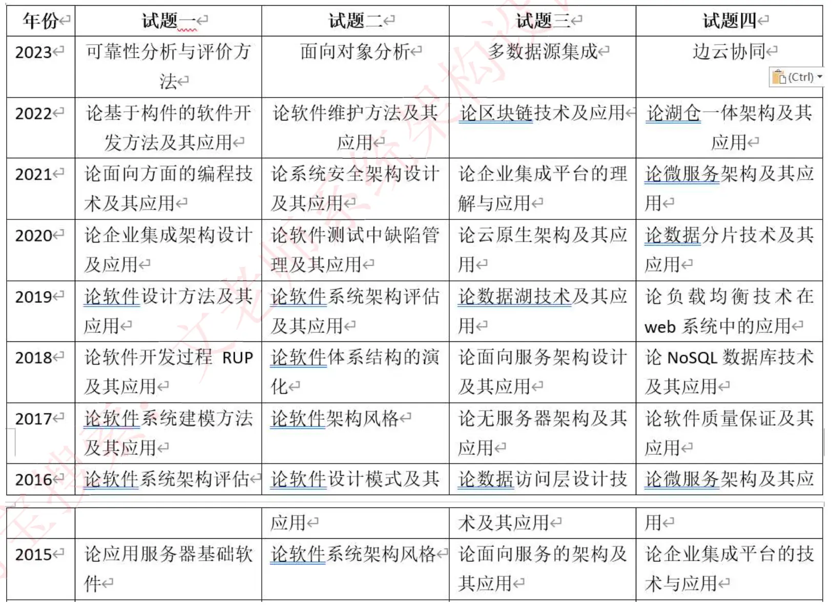 后面论文题目架构方面的应该从八大架构里出,排除掉信息系统架构、嵌入式架构、通信系统架构和最近已经考过的,大数据架构最近几次必考需要准备一下。